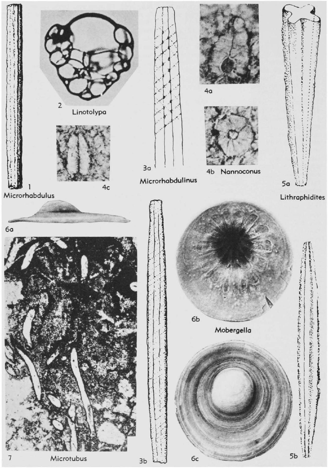 Microscopically small peg-shaped microorganisms with axial canal or large central cavity, 5 to >50 microns (commonly 15 to 20 μ) long, 5 to 10 microns wide; outline conical, spherical, pear-shaped, barrel-shaped, cylindrical, or U-shaped; composed of numerous wedge-shaped individual elements; wedges arranged in mounting spiral or spirals, oblique to axis, 2 terminal apertures. [Systematic position "still obscure" (BRONNIMANN, 1955); ?skeletal remains of planktonic Protozoa; regarded as embryonic stage of Lagena or Lagena proper (DE LAPPARENT, 1931), as alga (CADISCH, fide COLOM, 1945) and as belonging to Fibrosphaera DE LAPPARENT (COLOM, 1945); ?relationship to oogonia of algae (BRONNIMANN, 1955); see also CAMPBELL, 1954, p. DI70-DI71.]
